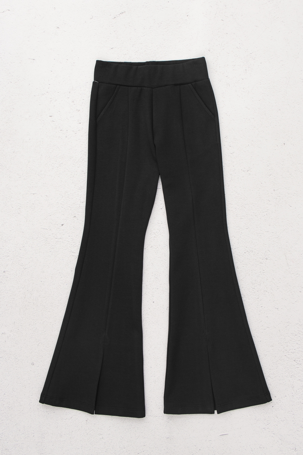 Расклешенные брюки - стильная модель для повседневного гардероба. Сшиты из плотного эластичного трикотажа джерси на основе хлопка. Брюки на эластичном поясе, два боковых кармана, клеш от колена, снизу разрезы.