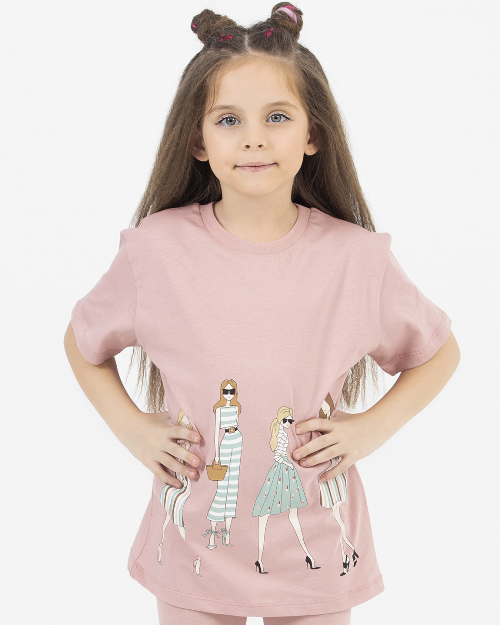 Футболка для девочки оптом прямого кроя с округлой горловиной.  Благодаря  принту футболка выглядит нарядно,оригинально по девчачьи мило и кокетливо. Футболка прекрасно сочетается с лосинами, бриджами и шортами.
