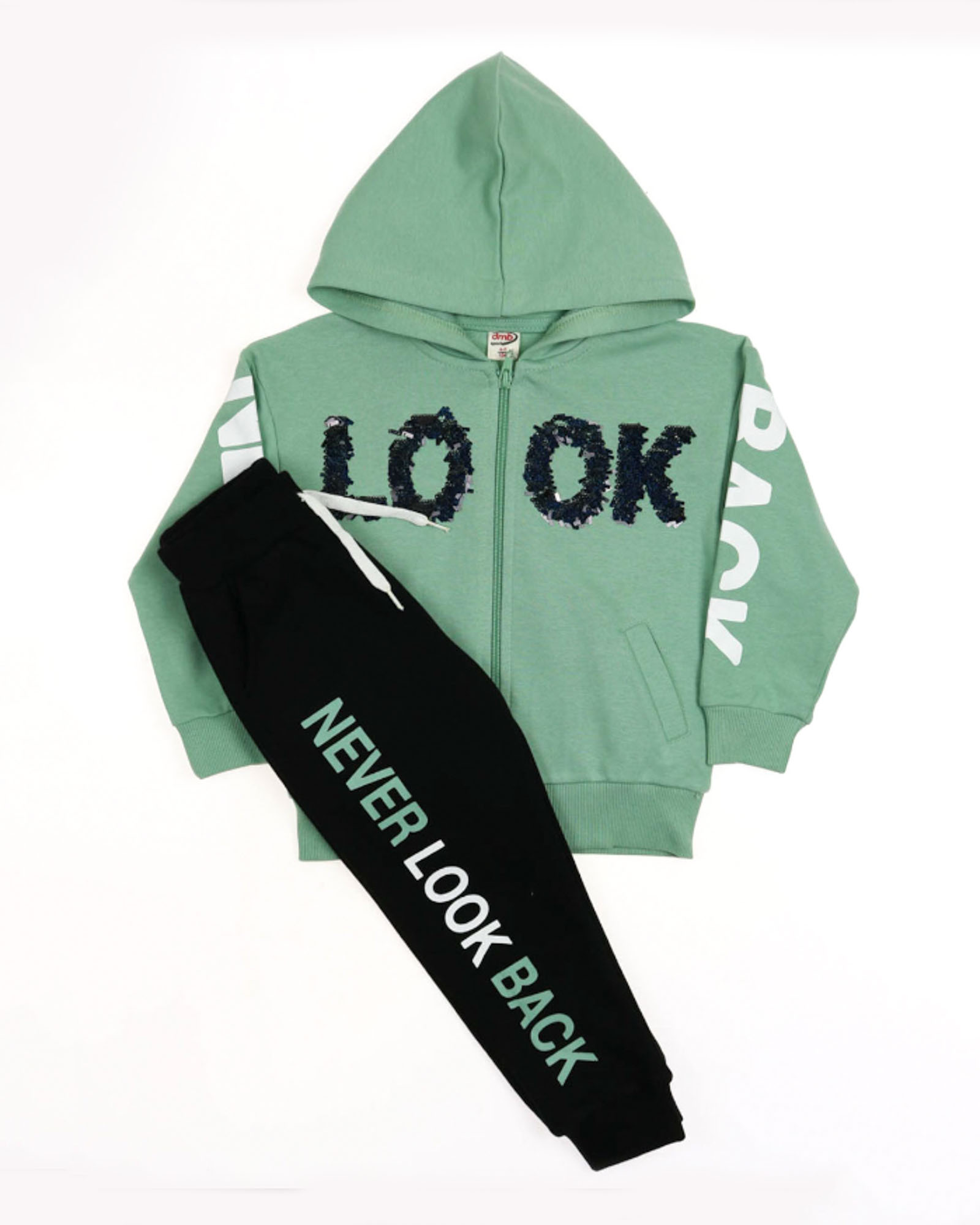 Стильный спортивный костюм для девочки выполнен из трикотажа футер (петля). Толстовка на молниии с капюшоном. На груди аппликация из пайеток. Брюки умеренного объема зауженные к низу.