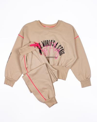 Базовый однотонный спортивный костюм для девочки из тонкого футера без начеса . Комплект одежды состоит из свитшота с принтом и брюк. Такой костюм станет отличным дополнением гардероба любой девочки как для повседневной носки, так и для занятий спортом, бегом, для физкультуры в школе, а также будет уютным, мягким домашним нарядом в прохладное время года!