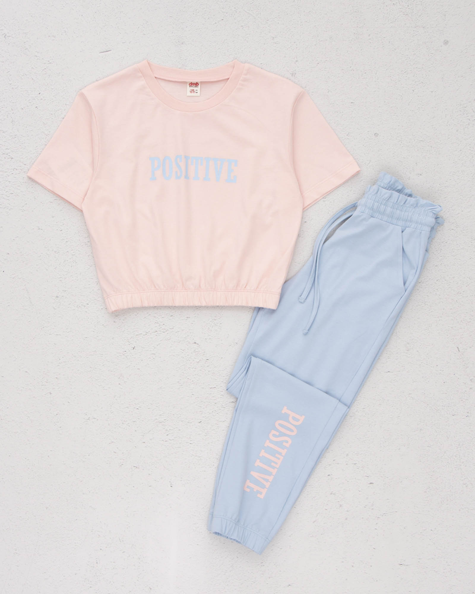 Трикотажный костюм с брюками. Брюки с карманами на эластичном поясе с регулирующим шнурком, манжеты на резенке.Футболка укороченного кроя на резинке.