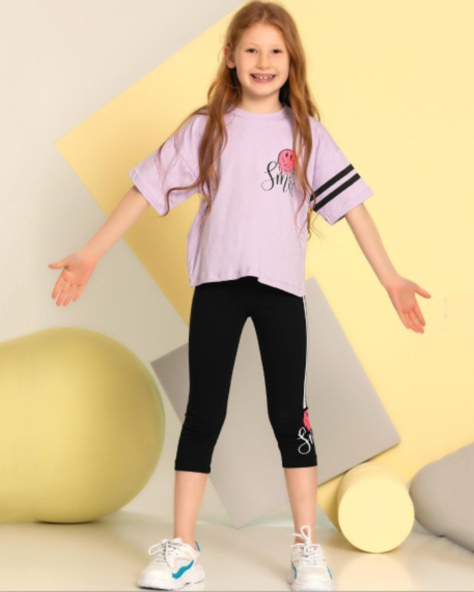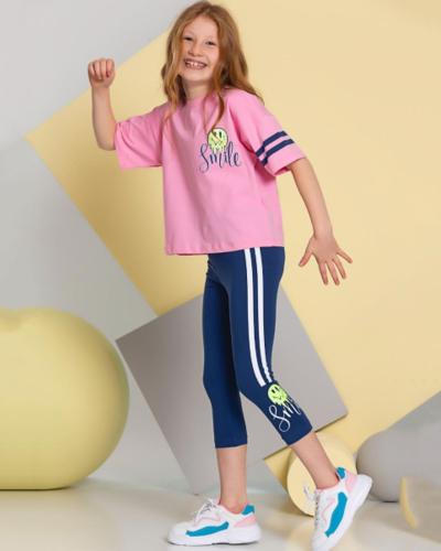 Укороченная футболка со спущенным рукавом и бриджи делают летний комплект оригинальным и стильным. Костюм выполнен из мягкого трикотажа кулирка.