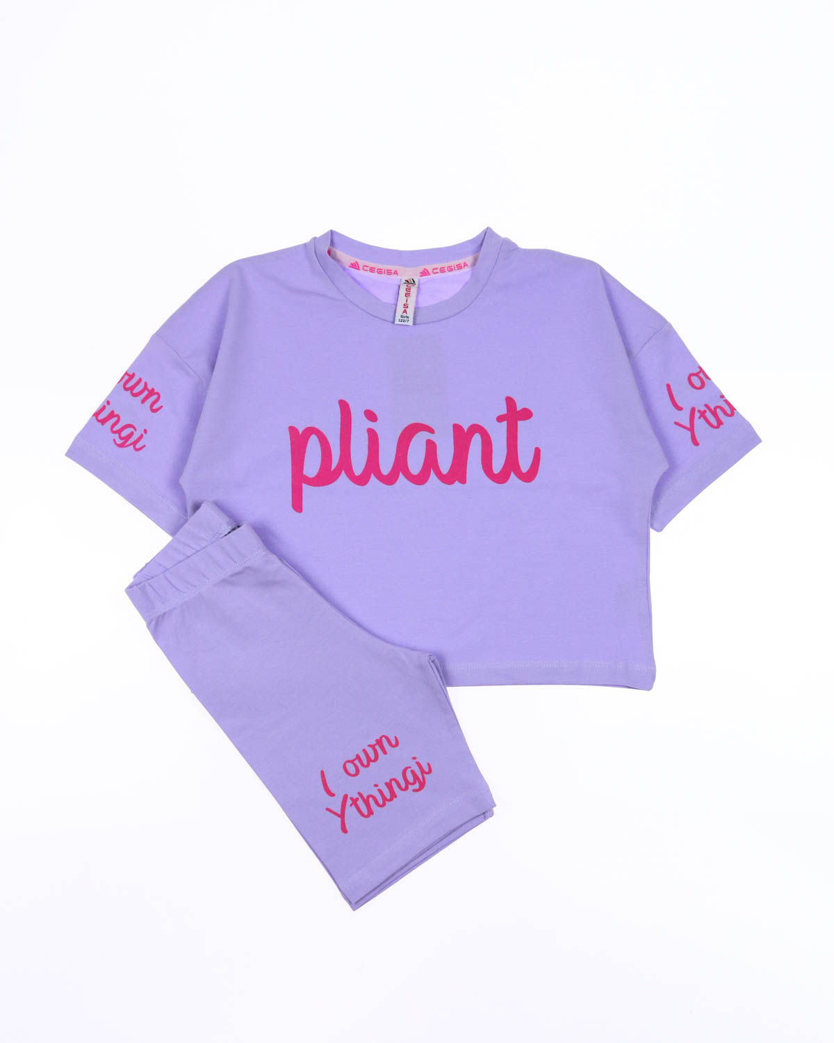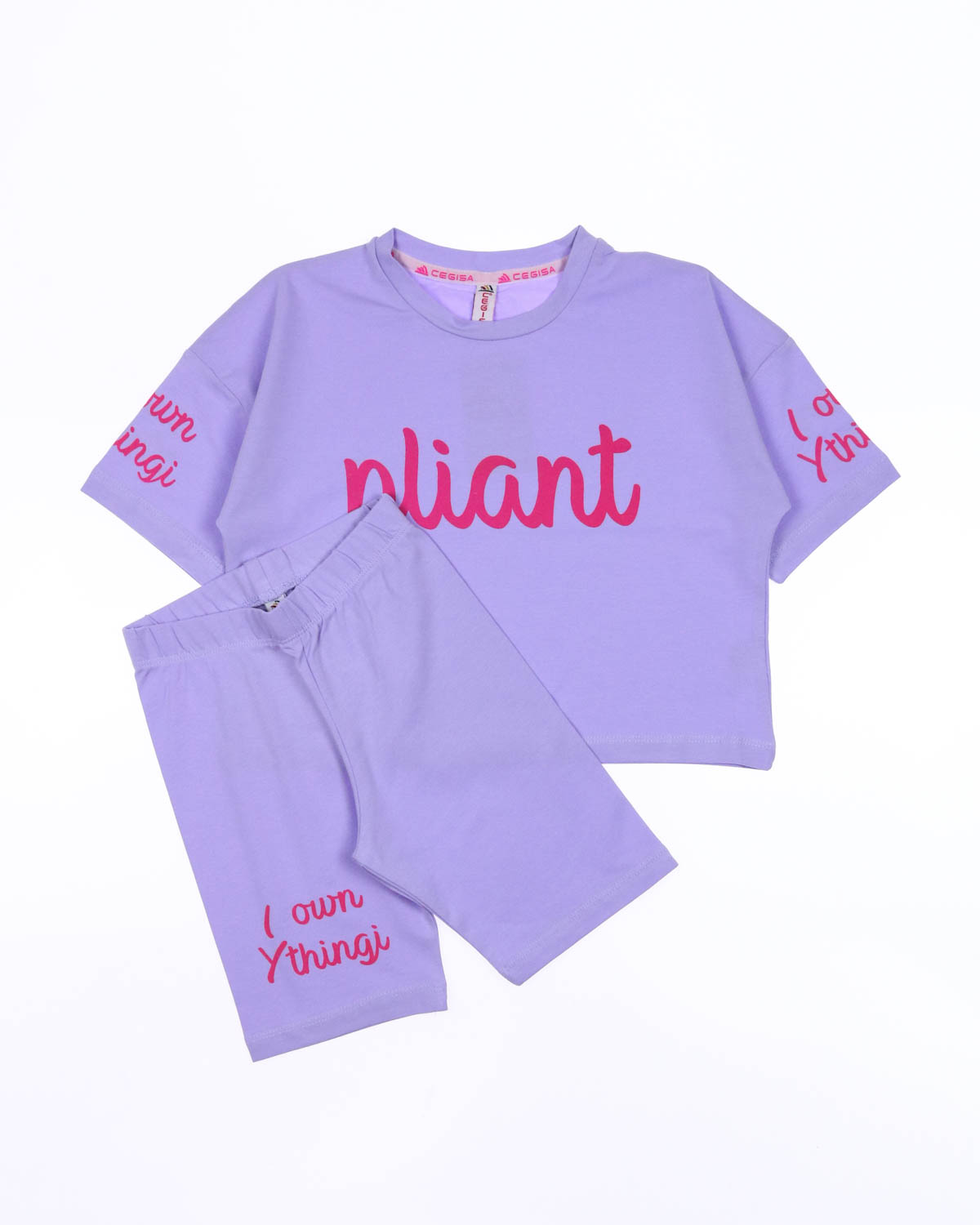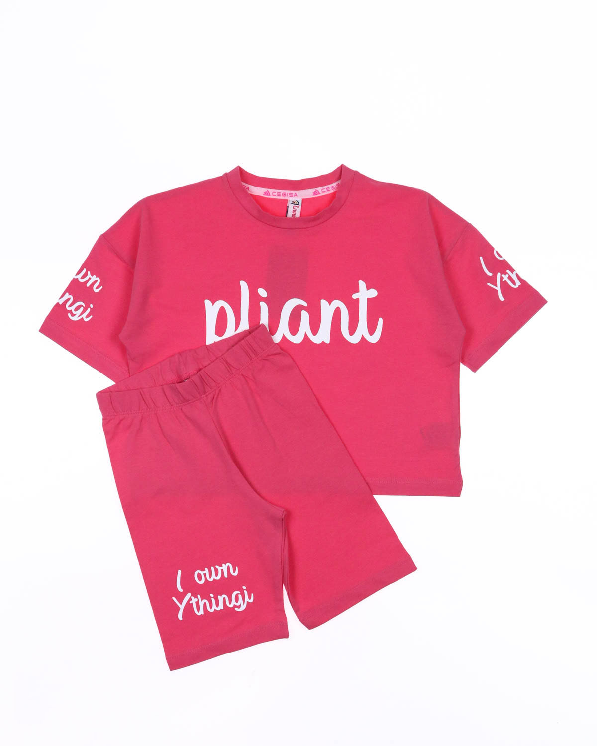 Летний костюм из эластичного трикотажа кулирка. Футболка прямого кроя, со спущенной линией плеча и велосипедки.