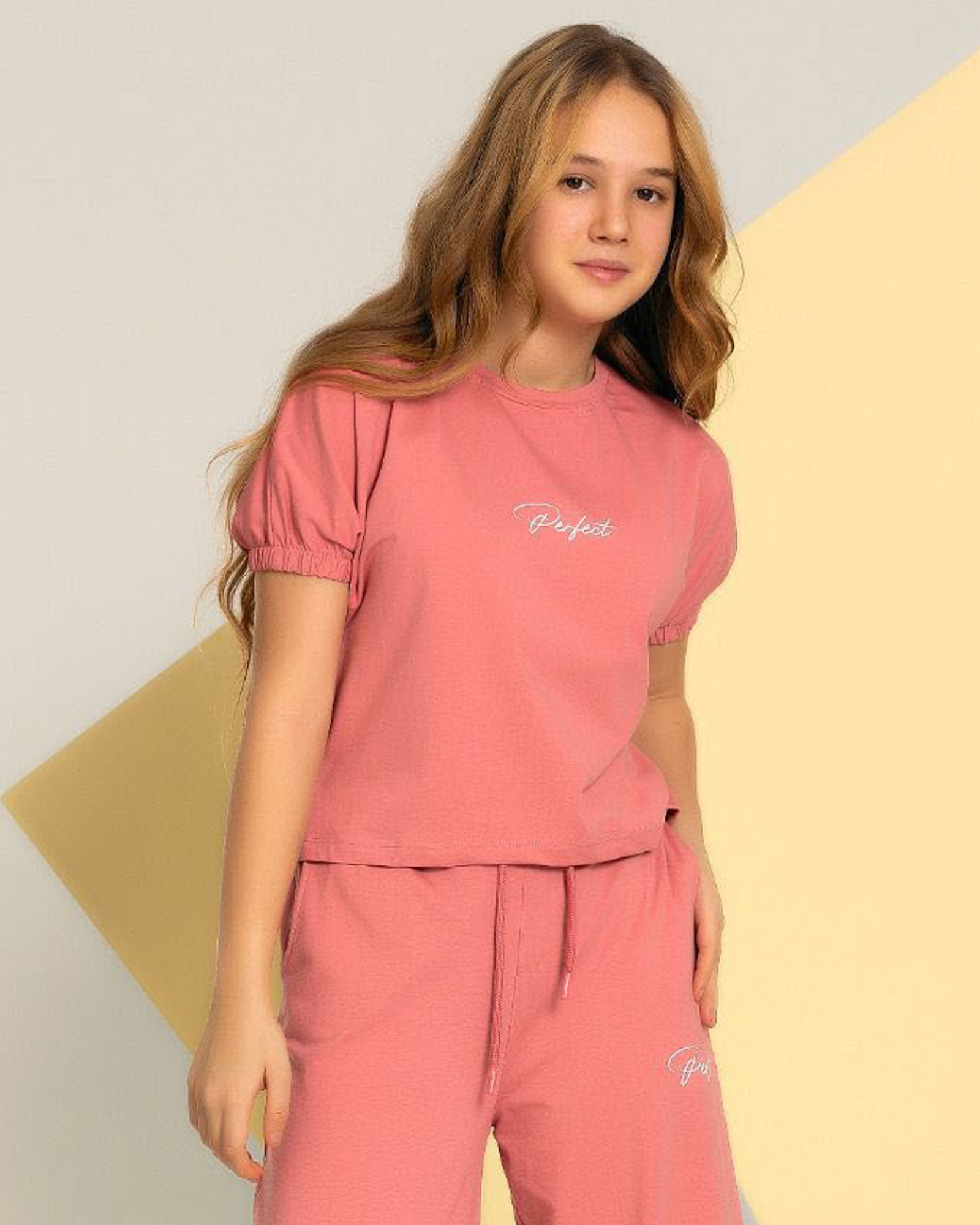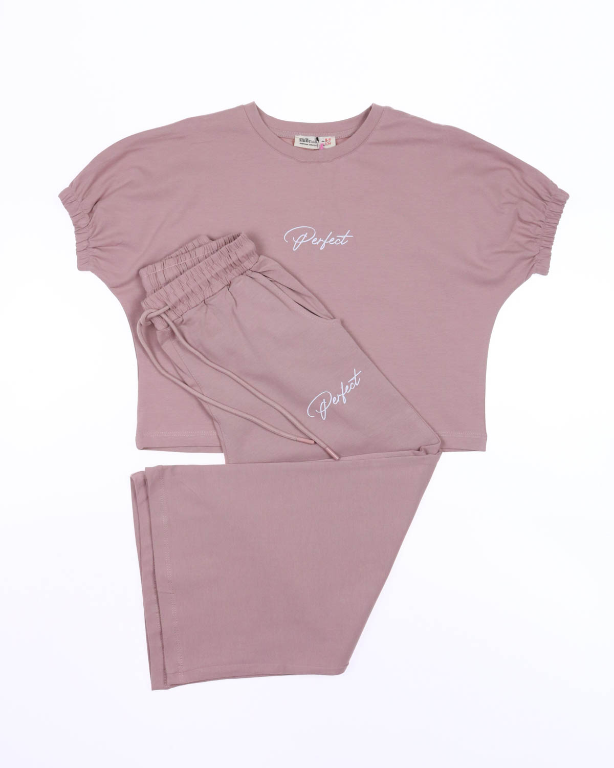 Комплект Smile оптом состоит из свободных брюк на широкой резинке и укороченной футболки. Рукава присборенны эластичной резинкой.