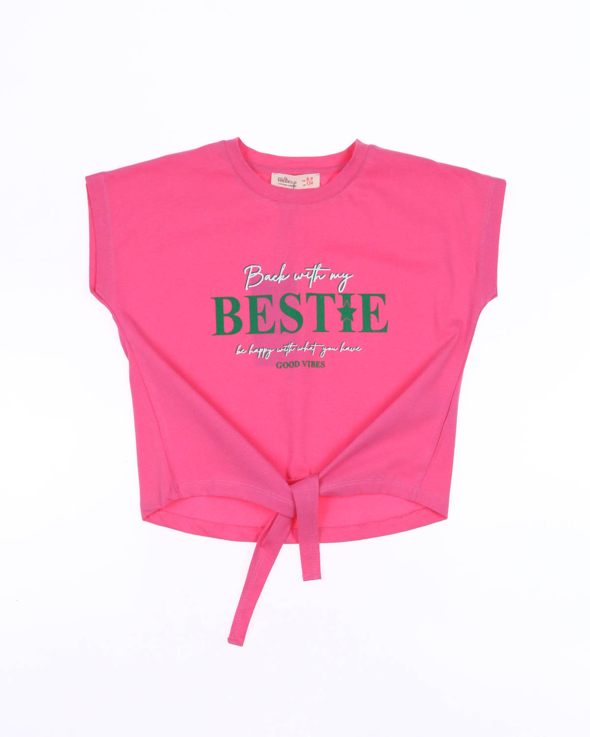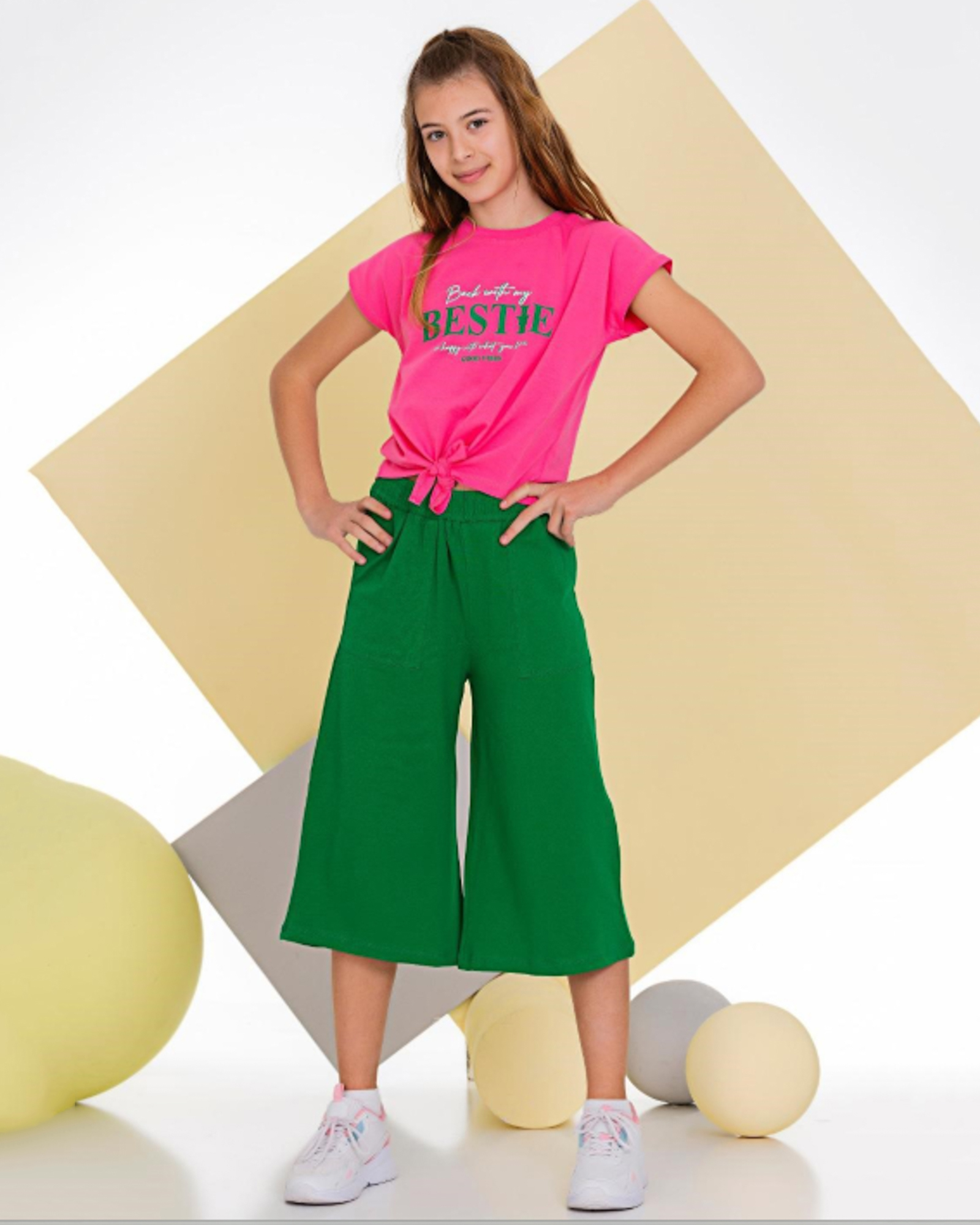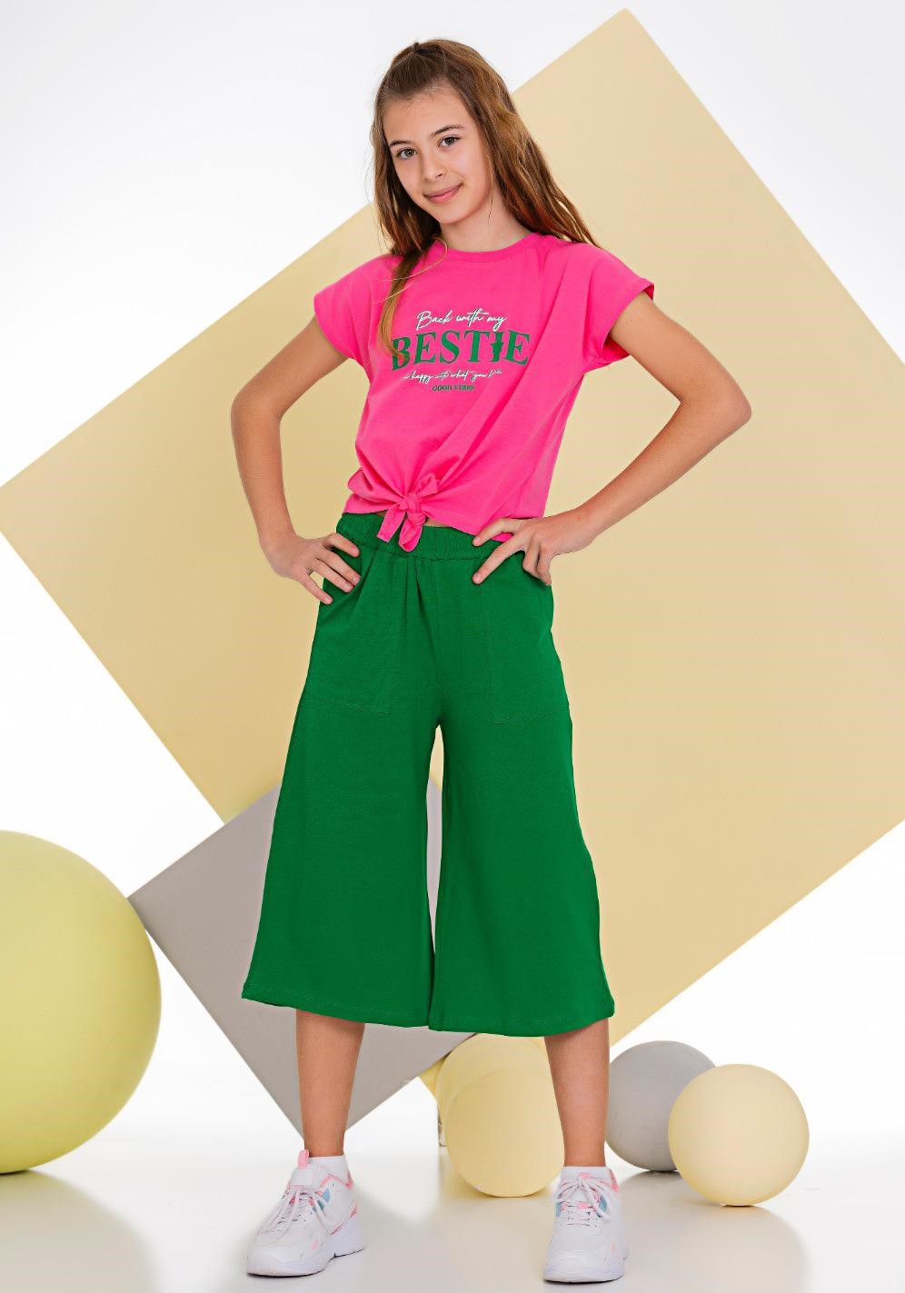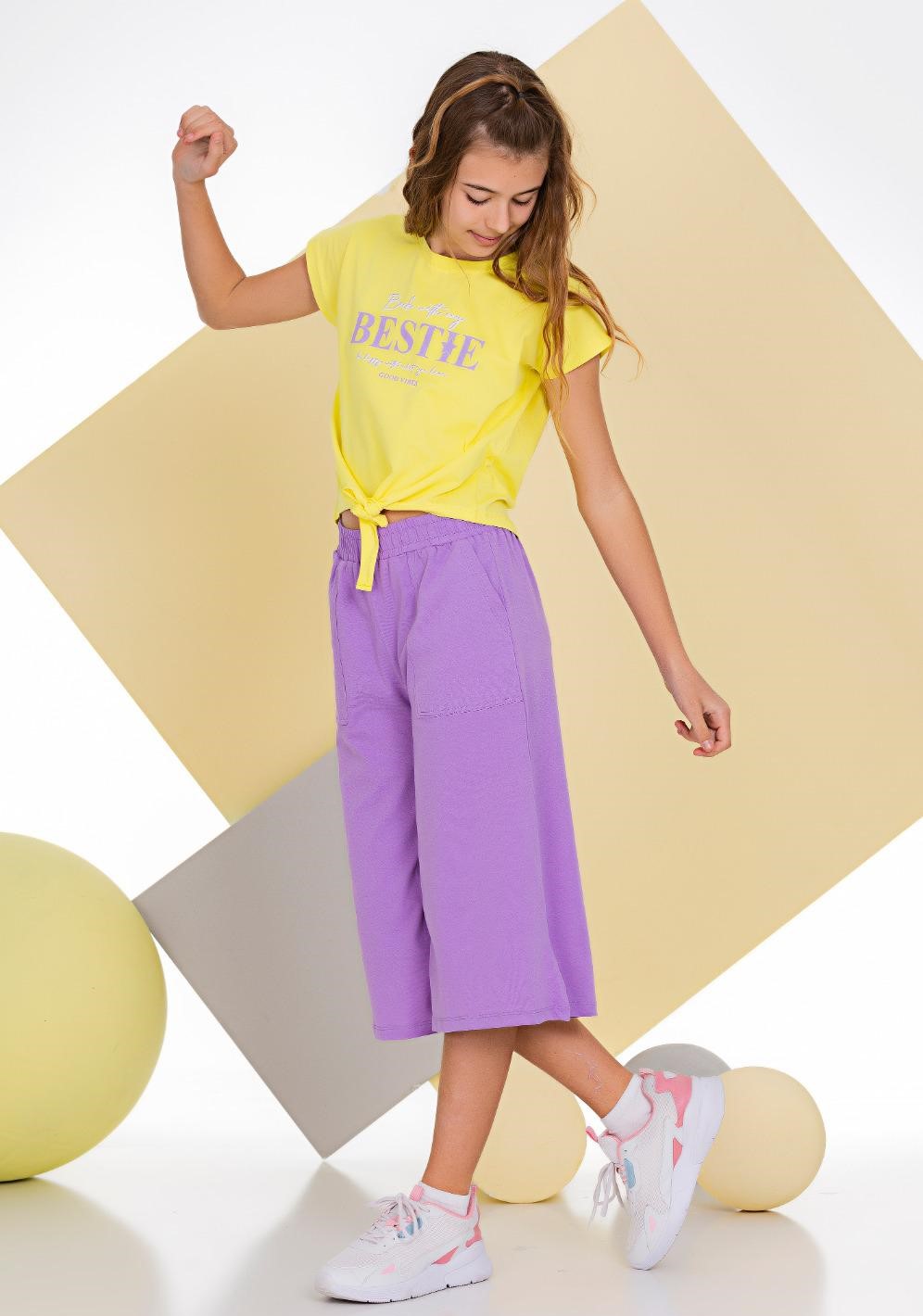 Представляем вам яркий летний костюм Smile для девочек оптом. Укороченная футболка со спущенным рукавом на завязках и широкие брюки-кюлоты. Костюм выполнен из мягкого трикотажа кулирка.