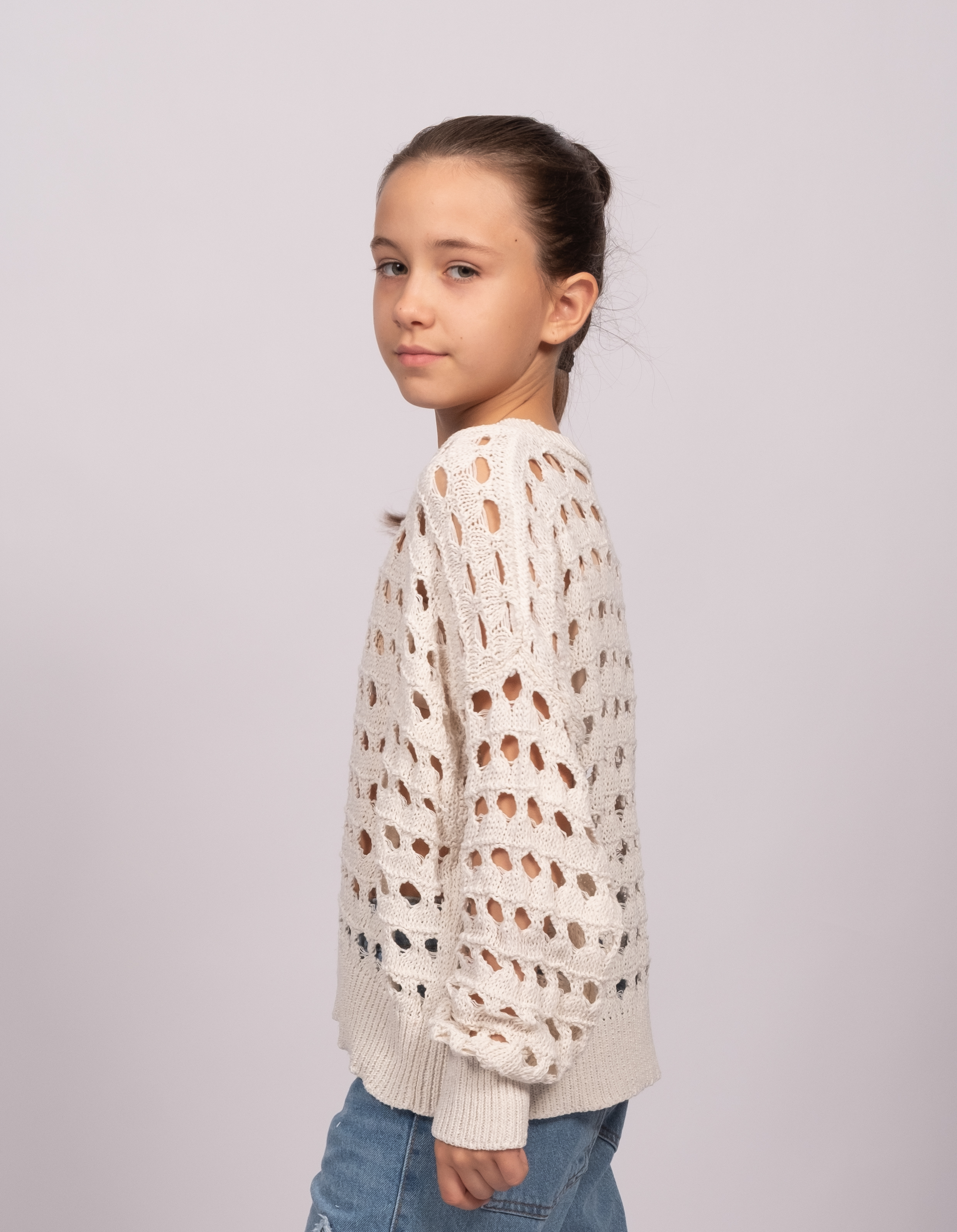 Джемпер DMB для девочек ажурной вязки оптом, выполнен из 100% хлопка. Свободный крой, круглый вырез горловины. Модель отлично сочетается с любой одеждой. Под низ можно надеть удлиненный или короткий топ в тон джемперу.