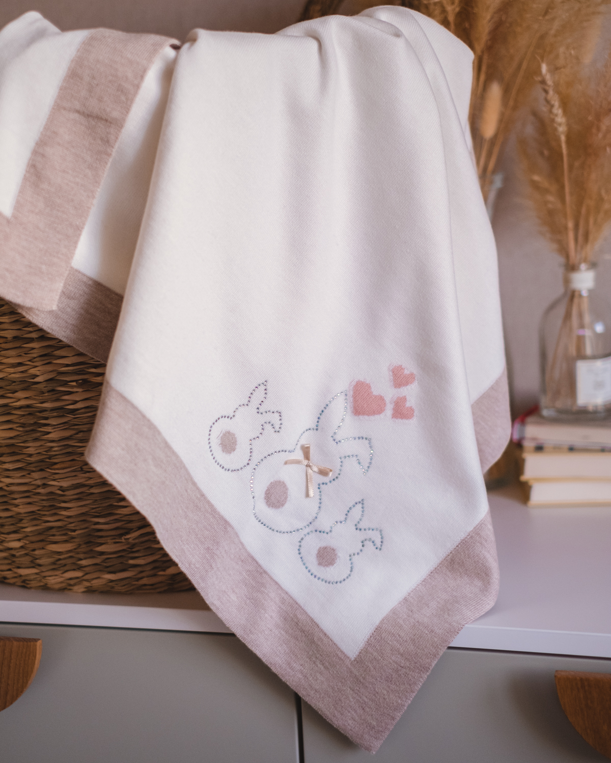 В углу на этой модели изображены милейшие зайчики. Контур сделан из аккуратных страз, у большого зайчика на шее пришивной бантик.
