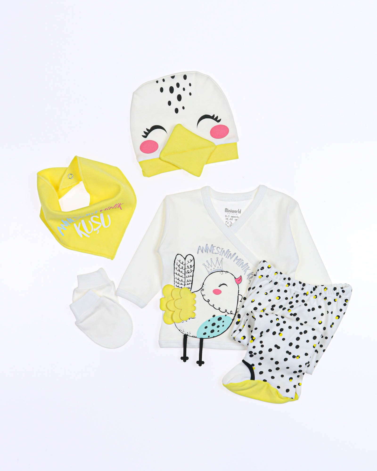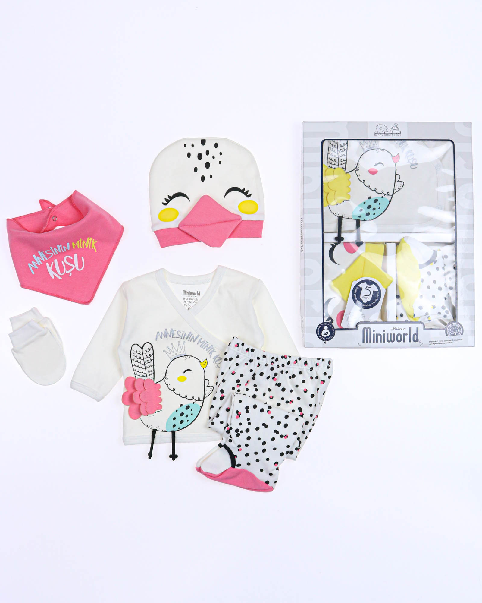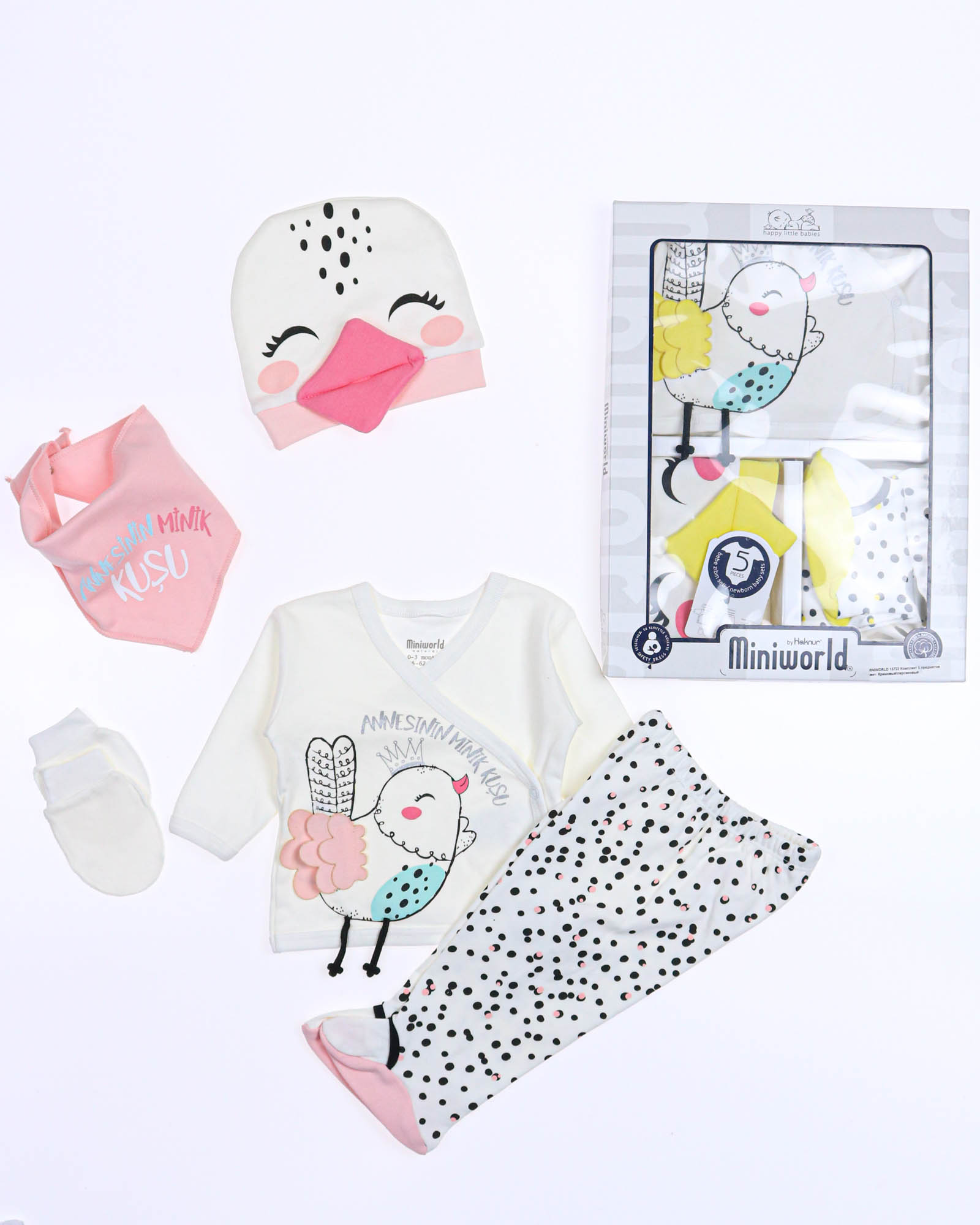 Детский комплект для новорожденного ребенка из 5 предметов, упакован в красивую подарочную коробку с прозрачным окошком. В комплект входит : распашонка, рукавички-царапки, слюнявчик, ползунки и шапочка. Комплект отлично подходит для первого подарка.