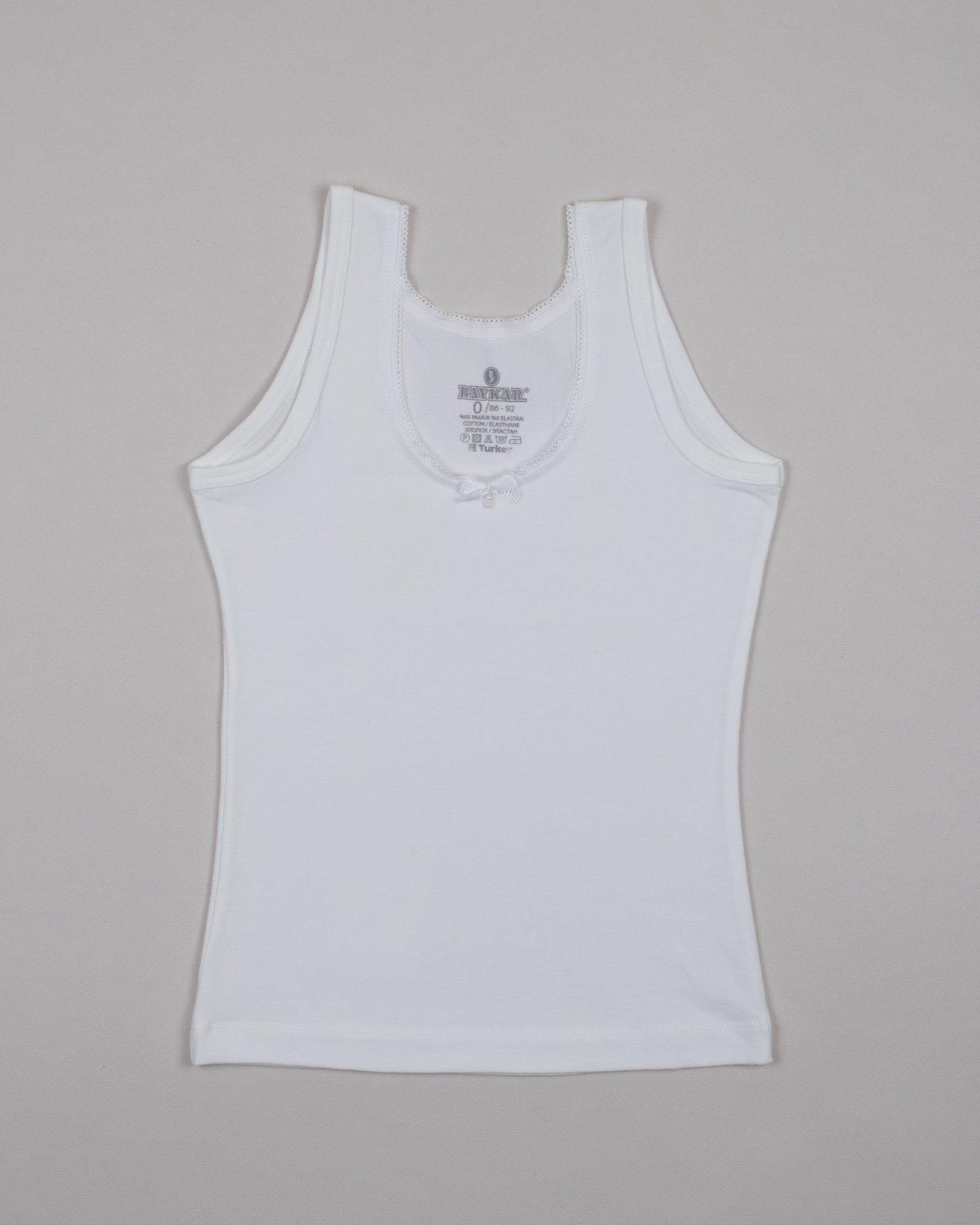 Белая бельевая майка Baykar для девочек оптом. Однотонная майка без рисунка, классическая модель для ежедневной носки. Майка для девочки идеально под блузки белого цвета. Майка на тонких и широких бретелях может использоваться как для сна , в школу , под одежду . Ткань очень практична, комфортна и гипоалергенна. Белье для девочек не мнется, хорошо тянется, сохраняя первоначальный вид после многочисленных стирок.